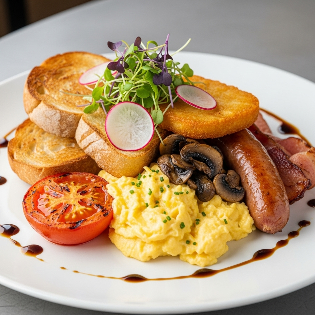 Eggs any style, Mushrooms, Toast, Bacon, Tomato, Sausage, Hashbrown