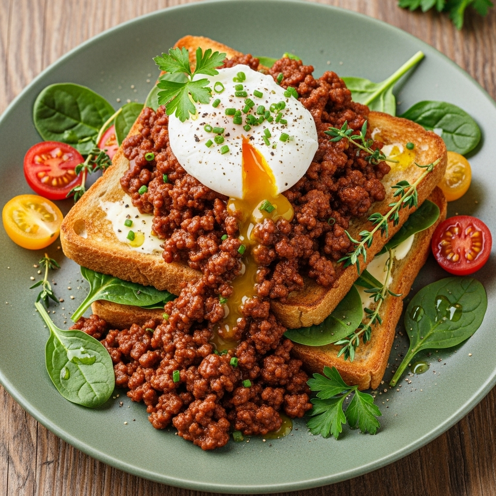 Enjoy the ultimate comfort of mince on toast—our savoury beef mince, slow-cooked with herbs, onions, and colourful veggies, generously served on crusty toast